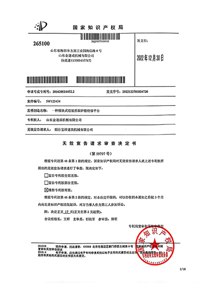 煙臺寶梓建筑機械有限公司抄襲的專利(專利號:201820409444.4),于2021年02月01日被國家知識產(chǎn)權(quán)局專利復(fù)審委員會宣告專利權(quán)全部無效。該公司惡意提起無效山東金道成機械有限公司有關(guān)專利的申請,經(jīng)過國家知識產(chǎn)權(quán)局專利復(fù)審委員會的有關(guān)審查程序,根據(jù)《專利法》第46條第1款的規(guī)定,于2022年12月30日對我公司兩項專利做出宣告專利權(quán)全部有效的審查決定。