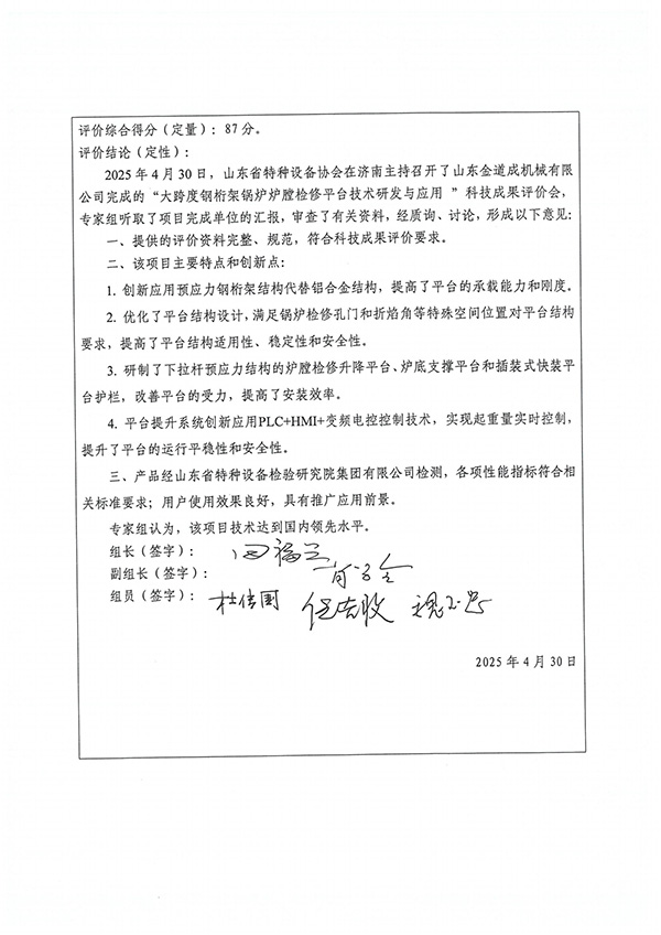 金道成鍋爐爐膛檢修平臺新技術獲國內權威認證